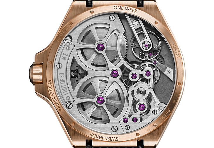 ARMIN STROM One Week Skeleton 首次推出玫瑰金版本,为经典镂空设计注入更高级的质感与温润光泽。此款腕表以鲜明的现代建筑风格著称,充分展现ARMIN STROM一贯的制表语言,同时向品牌创办人Armin Strom所热衷并推广的镂空艺术致敬。