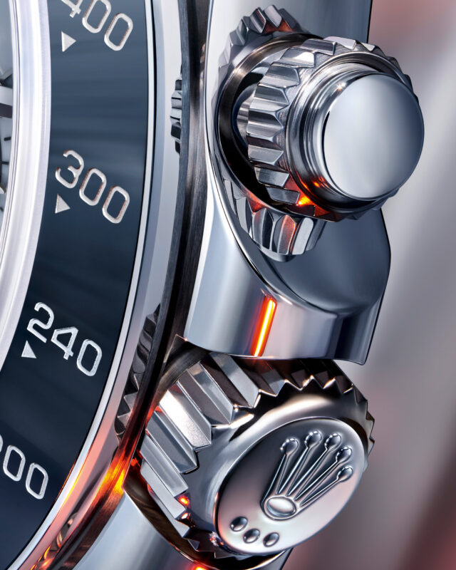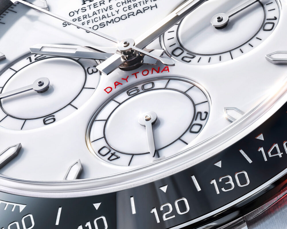 Platinum is used more selectively, appearing on details such as the caseback ring and the slim ring encircling the bezel. As with other Daytona models, the Oyster case measures 40mm in diameter and offers water resistance to 100 metres.