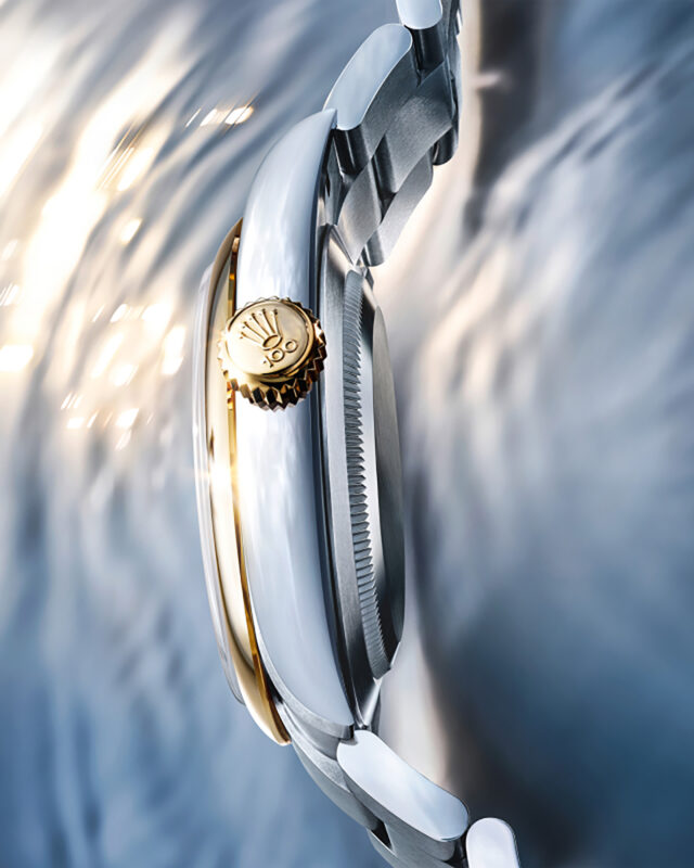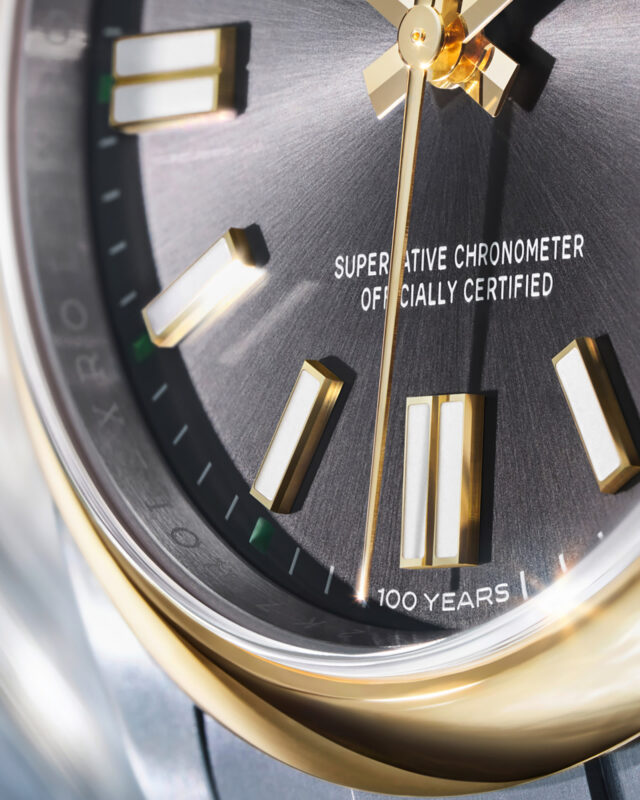 One of the few overt anniversary details appears on the crown itself, where the traditional coronet motif is accompanied by a subtle “100” marking beneath it. Both the crown and the smooth, rounded bezel are crafted in polished yellow gold, giving this version just enough visual distinction within the lineup. As with the rest of the modern Rolex Oyster Perpetual family, it maintains a practical 100 metres of water resistance.