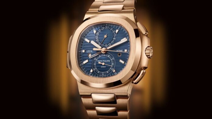 The Patek Philippe Nautilus Travel Time Chronograph 5990/1R-001 is worn on a solid rose gold bracelet with a fold-over clasp.